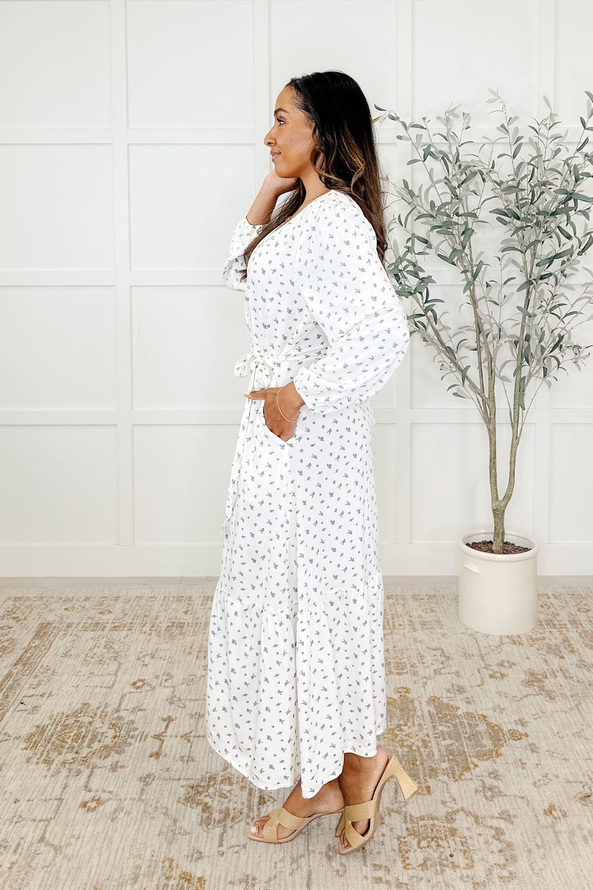 This woven Maple Dress features a V-neckline and gathered shoulder, with a cased elastic sleeve cuff and balloon sleeves for added style. It also includes an attached waist tie and functional side pockets. Perfect for a fun and flirty look, with a slight sheer effect.